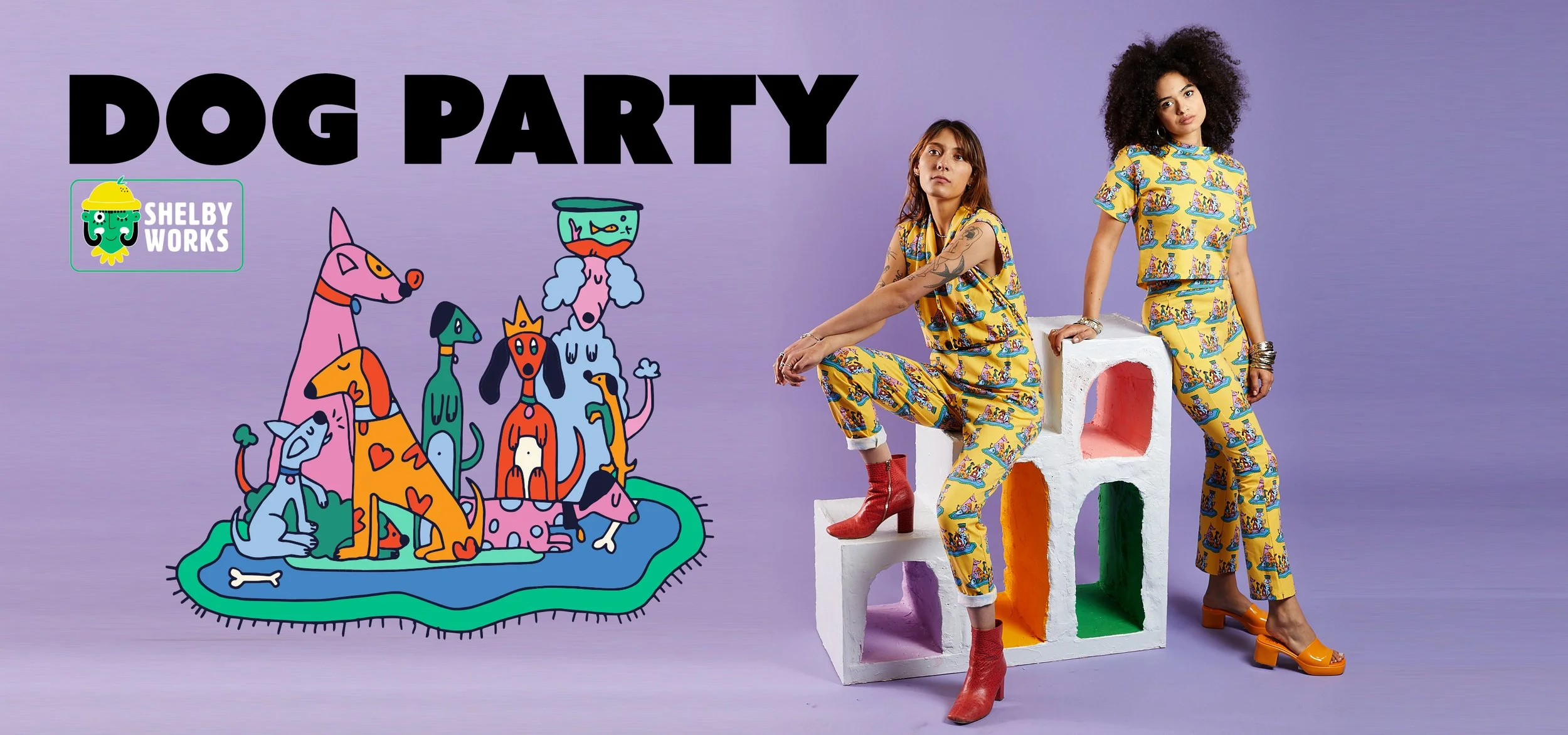 In 2021, Nooworks and I did a collaboration project where a couple of my designs were licensed to be transformed into a limited edition print collection. In April of 2022 my design titled “Dog Party” was released on various products ranging from jumpsuits, overalls, dresses, and kids clothing. Check out their website below for the full collection. Dog Party Click Here